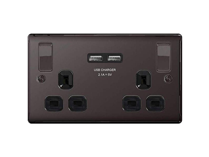 The BG Nexus Metal NBN22U3B is a 2 gang double pole switched twin socket with two USB sockets finished in black nickel.