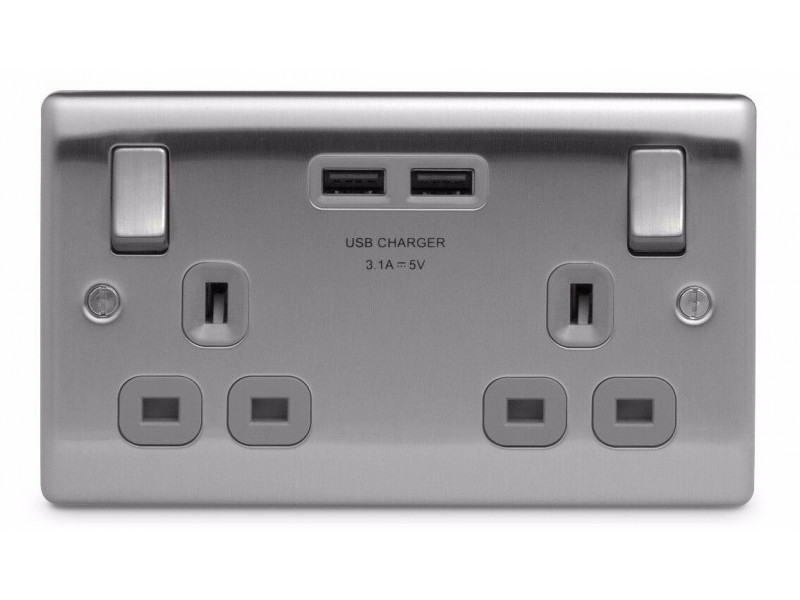 The BG Nexus Metal NBS22U3G is a 2 gang double pole switched twin socket with two USB sockets finished in brushed steel.
