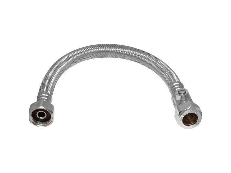 Flexible tap connector with 15mm compression with integrated isolating valve on one end and an 1/2" female on the other. 300mm in length.