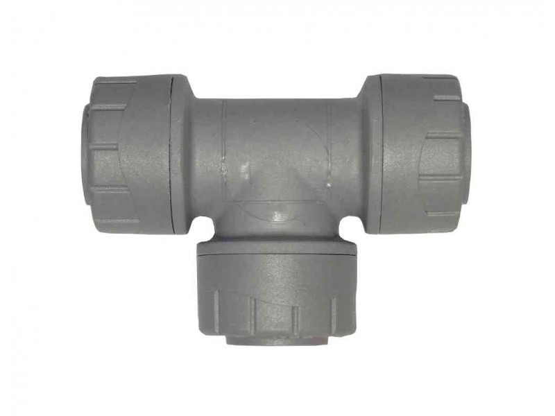 Polypipe Polyplumb 10mm Tee Grey. PolyPlumb is a permanent grey plastic push-fit system for domestic hot and cold water supply, radiator and underfloor heating installations.