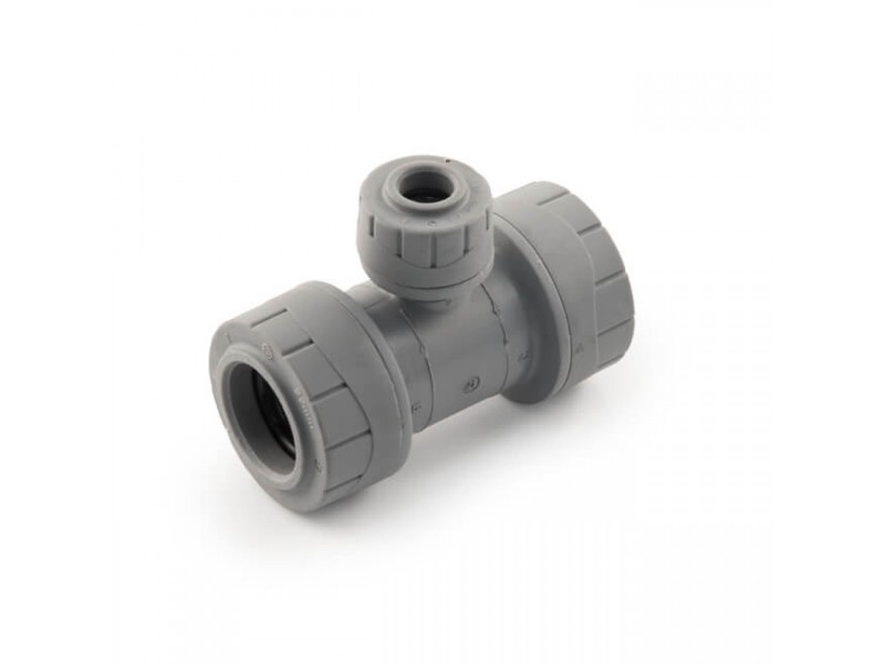 Polypipe Polyplumb 15mm x 15mm x 10mm Tee Grey. PolyPlumb is a permanent grey plastic push-fit system for domestic hot and cold water supply, radiator and underfloor heating installations.